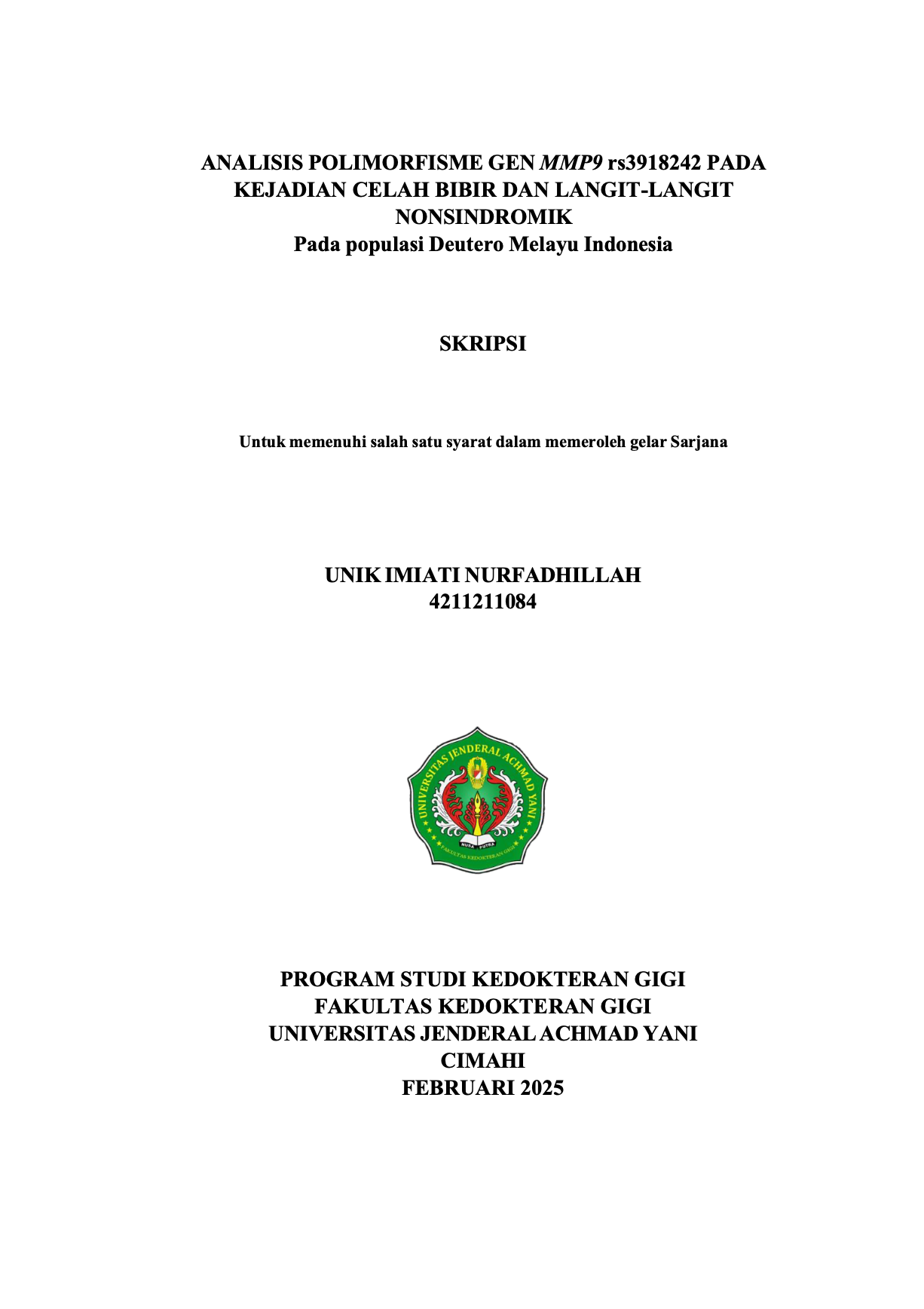 ANALISIS POLIMORFISME GEN MMP9 rs3918242 PADA KEJADIAN CELAH BIBIR DAN LANGIT-LANGIT NONSINDROMIK Pada Populasi deutero melayu indonesia