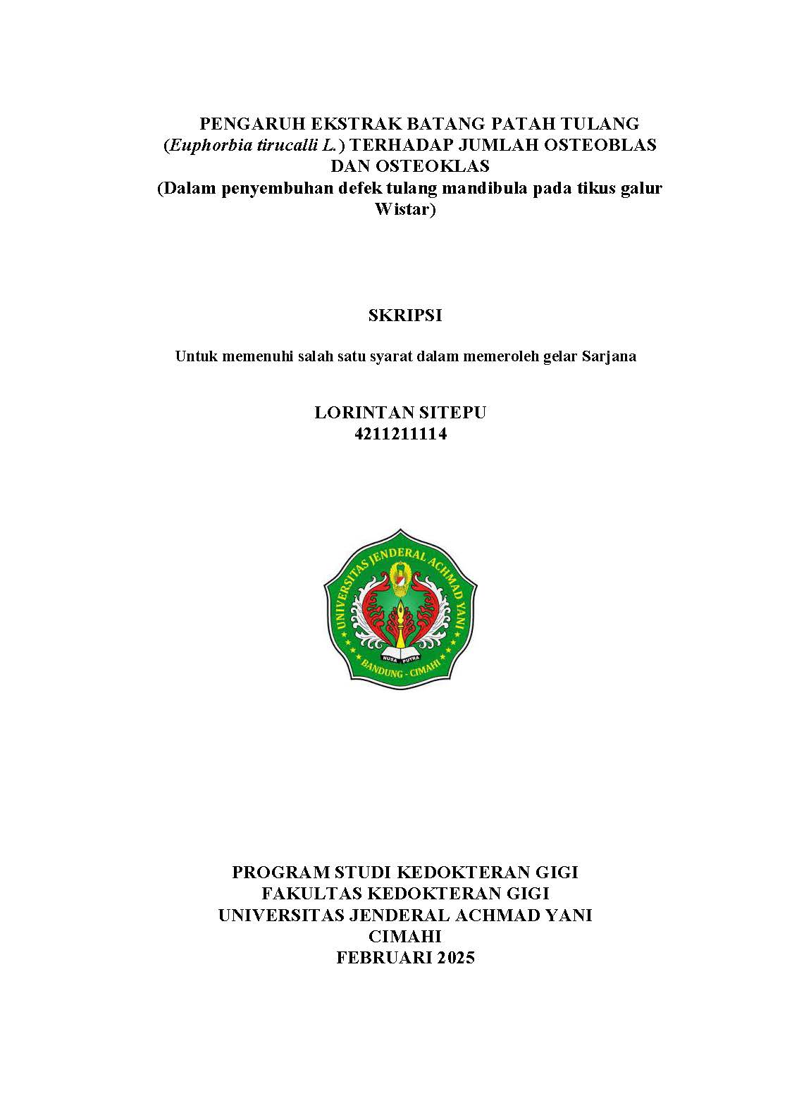 PENGARUH EKSTRAK BATANG PATAH TULANG (Euphorbia tirucalli L.) TERHADAP JUMLAH OSTEOBLAS DAN OSTEOKLAS (dalam penyembuhan defek tulang mandibula pada tikus galur wistar
