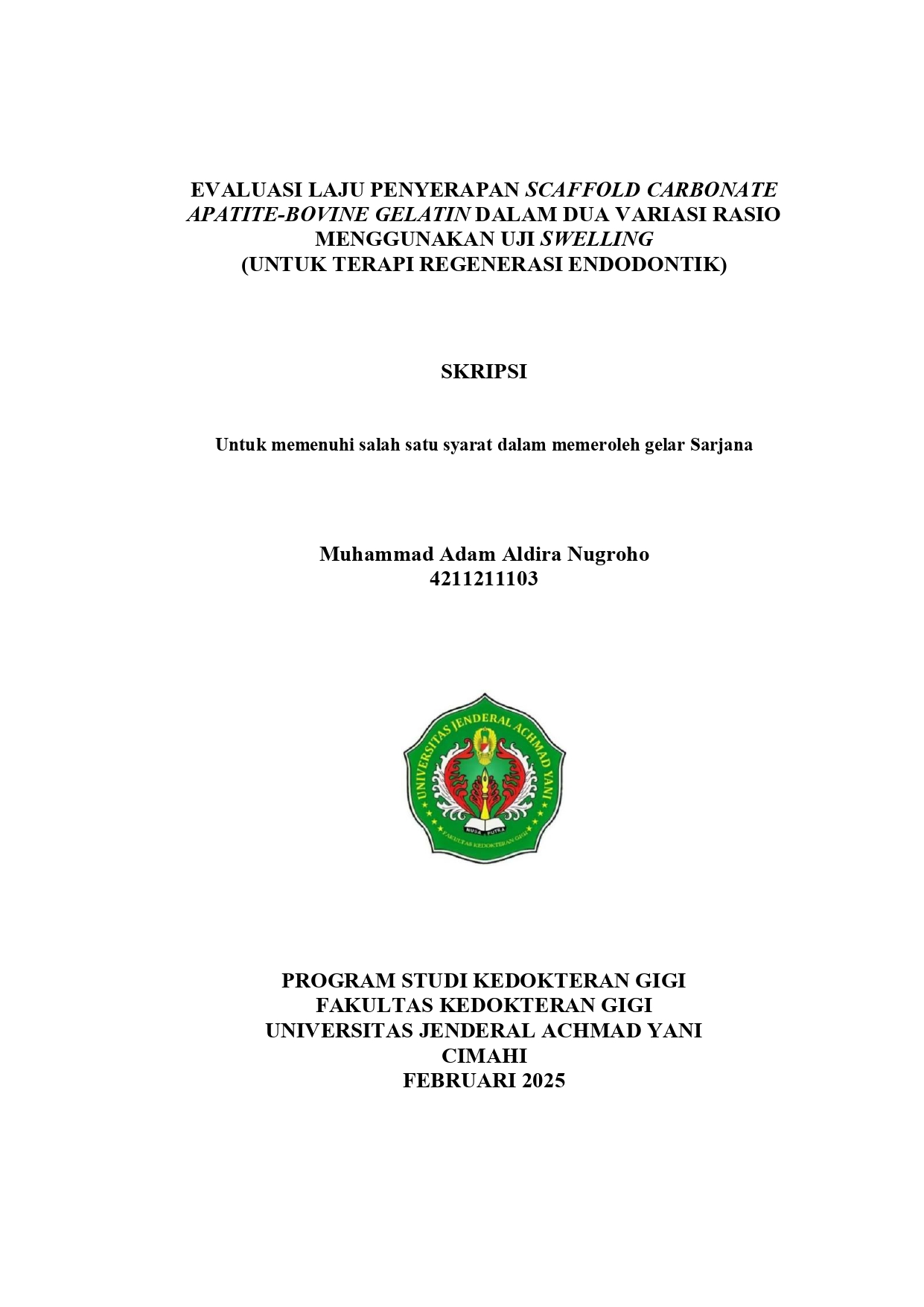 EVALUASI LAJU PENYERAPAN SCAFFOLD CARBONATE APATITE-BOVINE GELATIN DALAM DUA VARIASI RASIO MENGGUNAKAN UJI SWELLING (UNTUK TERAPI REGENERASI ENDODONTIK)