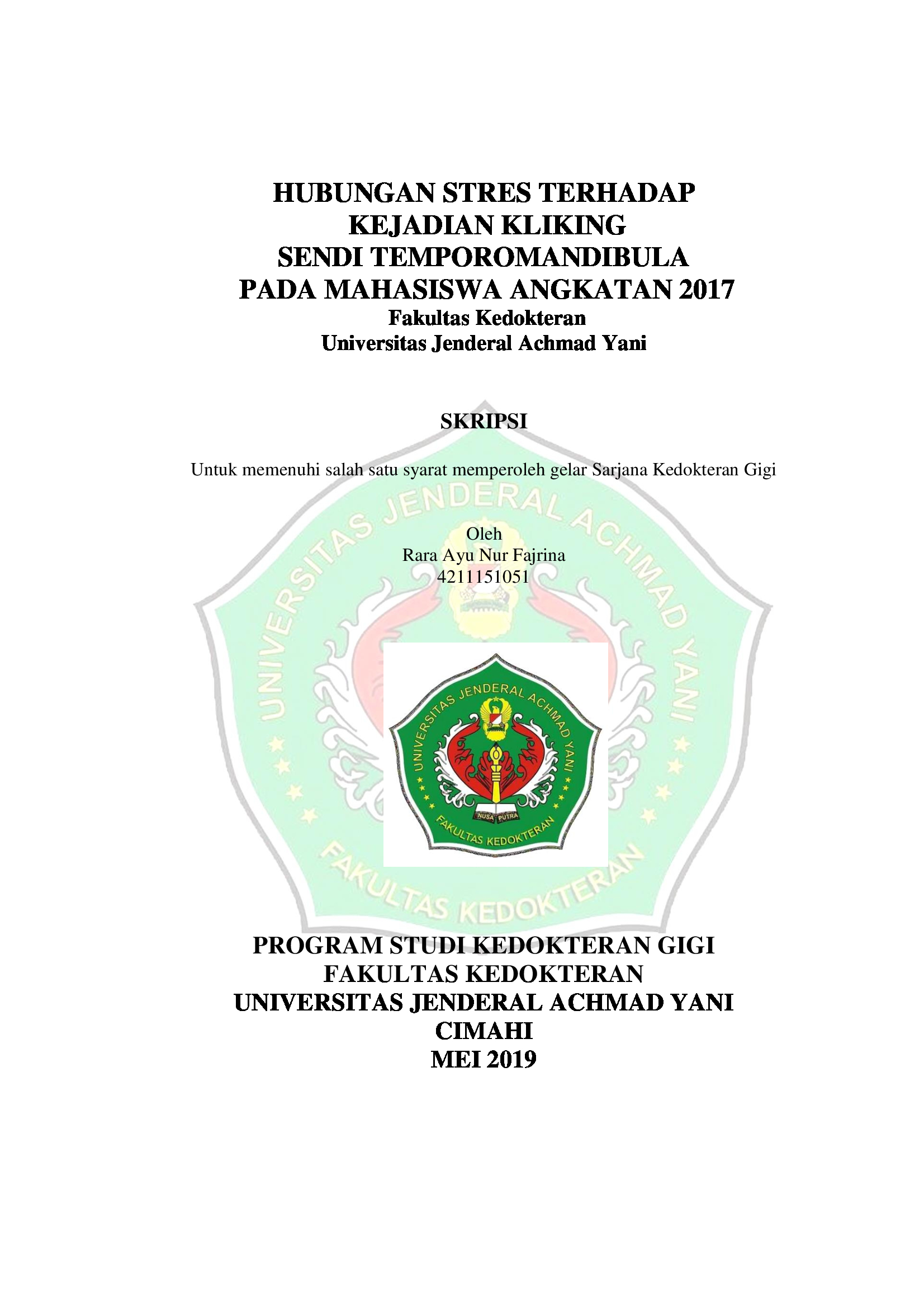 HUBUNGAN STRES TERHADAP KEJADIAN KLIKING SENDI TEMPOROMANDIBULA PADA MAHASISWA ANGKATAN 2017 FAKULTAS KEDOKTERAN UNIVERSITAS JENDRAL ACHMAD YANI