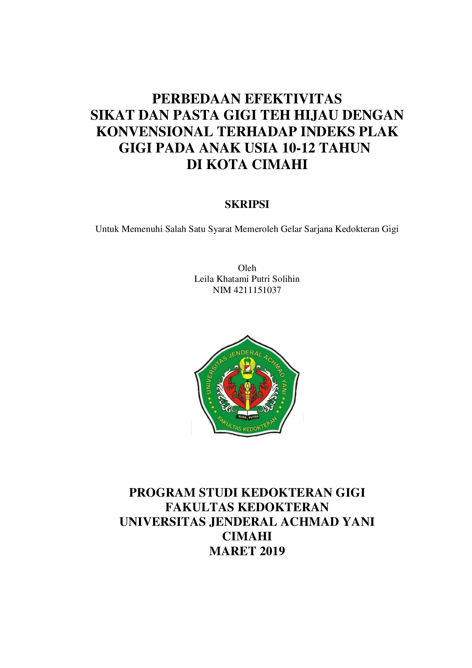 PERBEDAAN EFEKTIFITAS SIKAT DAN PASTA GIGI TEH HIJAU DENGAN KONVENSIONAL TERHADAP INDEKS PLAK GIGI PADA ANAK USIA 10-12 TAHUN DIKOTA CIMAHI