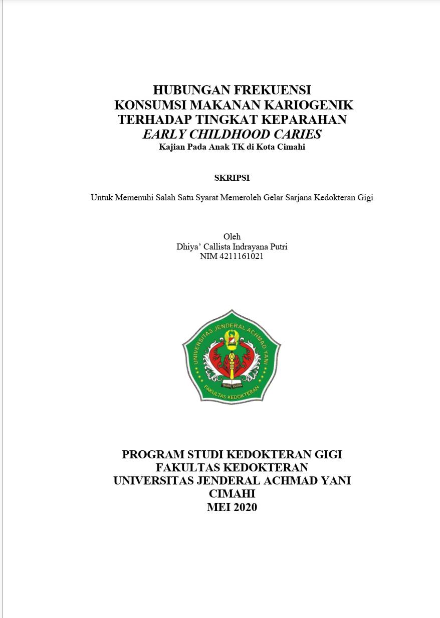 HUBUNGAN FREKUENSI KONSUMSI WAJANAN KARIOGENIK TERHAAP TINGKAT KEPARAHNAN EARLY CHILDHOOD CARIES KAJIAN PADA ANAK TK DIKOTA CIMAHI