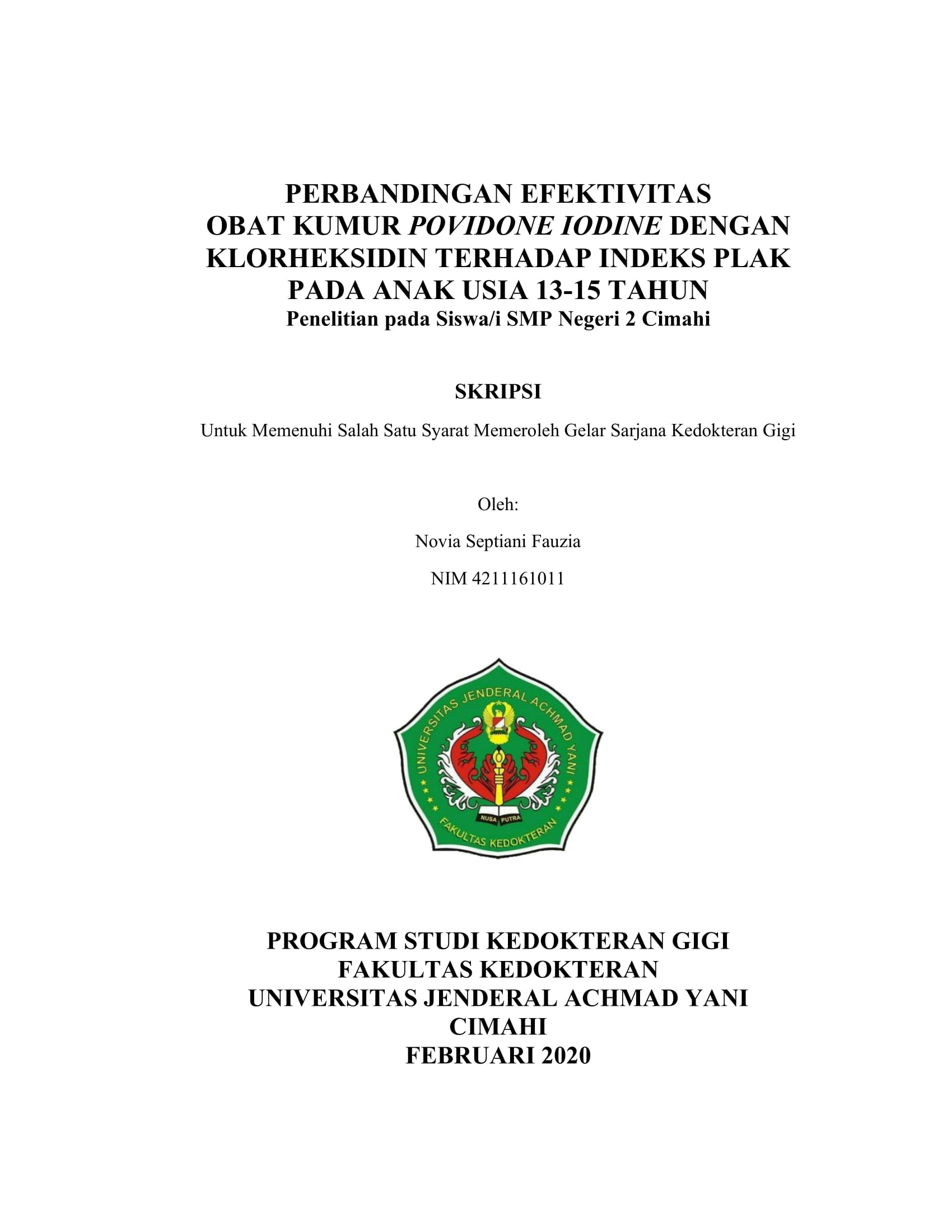 PERBANDINGAN EFEKTIVITAS OBAT KUMUR POVIDONE IODINE DENGAN KLORHEKSIDIN TERHADAP INDEKS PLAK PADA ANAK USIA 13-15 TAHUN Penelitian pada siswa/i SMP Negri 2 Cimahi