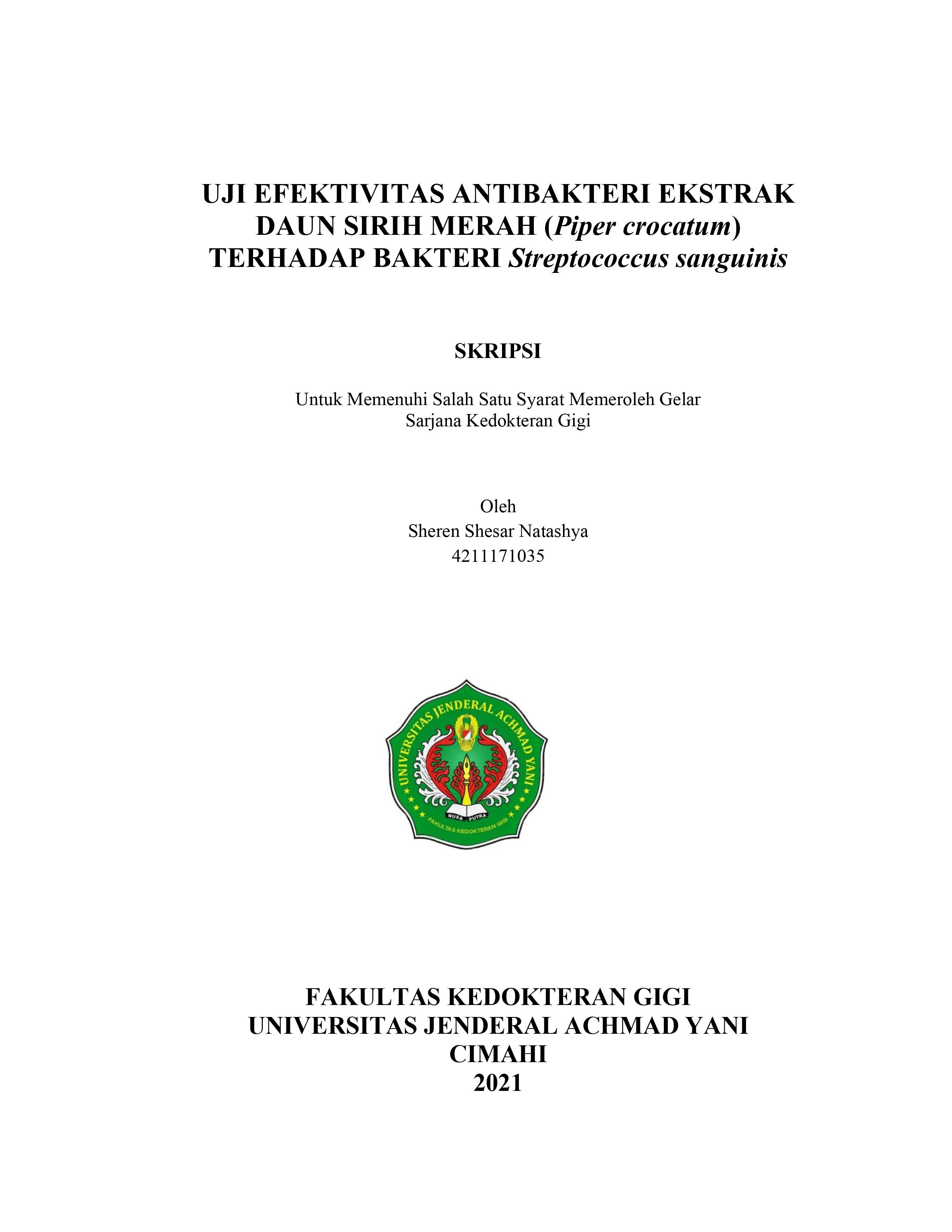 UJI EFEKTIVITAS ANTIBAKTERI EKSTRAK DAUN SIRIH MERAH ( Piper crocatum ) TERHADAP BAKTERI STREPTOCOCCUS SANGUINIS